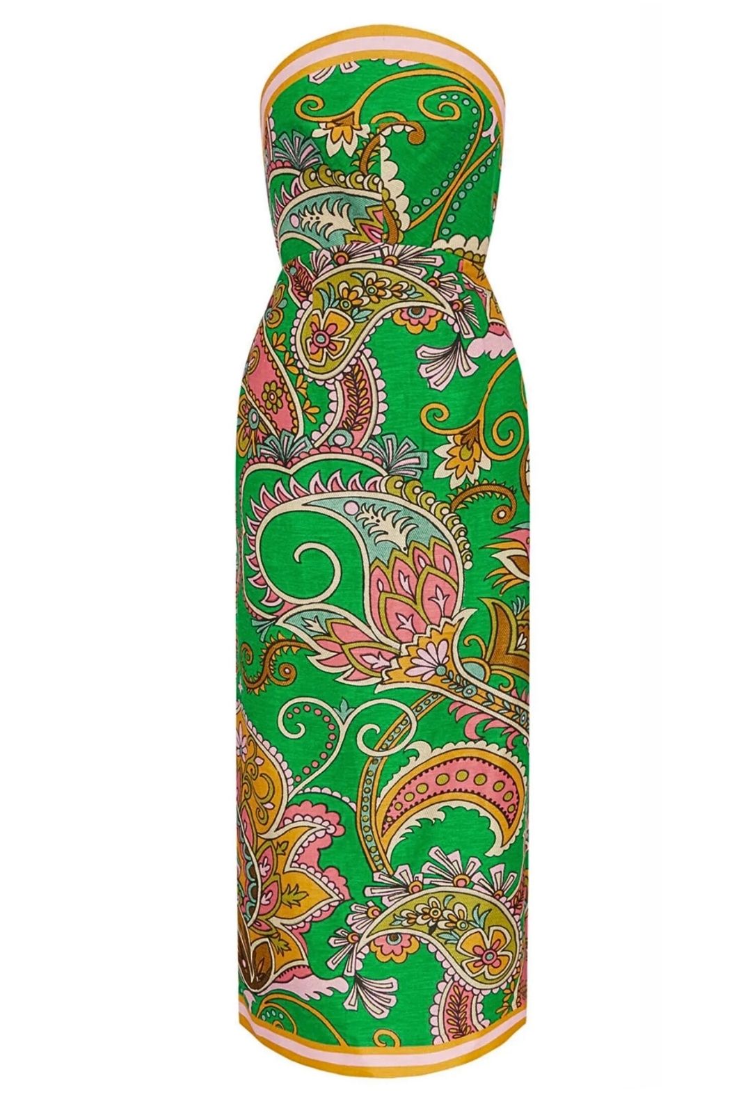 Showcasing a vibrant paisley pattern, this flattering strapless midi can be dressed up or down for any occasion.